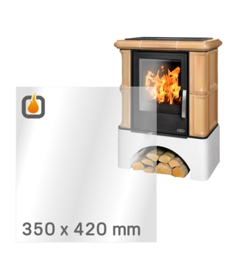 Das Glas hat die Maße 350 x 420 mm und eine Dicke von 4 mm. Es ist klar, beidseitig identisch und ideal als Ersatz für das originale Sichtglas Ihres Kaminofens.