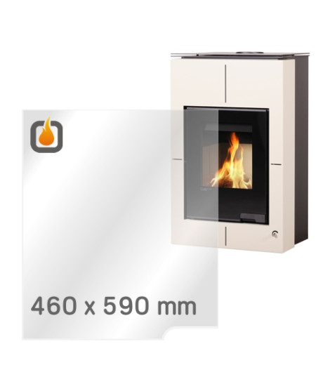 Das Glas hat die Maße 460 x 590 mm und eine Dicke von 4 mm. Es ist klar, beidseitig identisch und ideal als Ersatz für das originale Sichtglas Ihres Kaminofens.