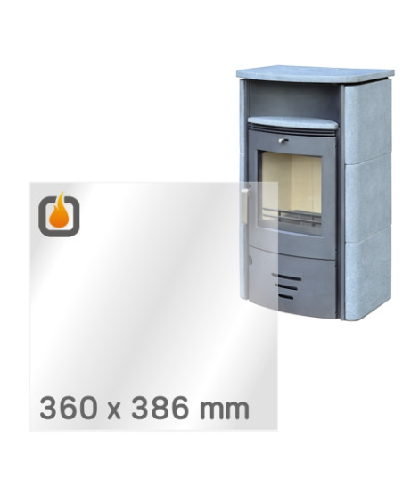 Das Glas hat die Maße 360 x 386 mm und eine Dicke von 4 mm. Es ist klar, beidseitig identisch und ideal als Ersatz für das originale Sichtglas Ihres Kaminofens.